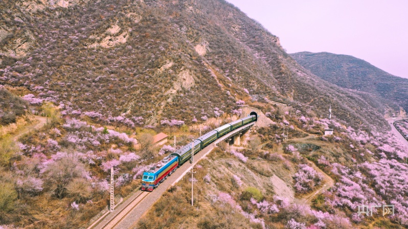 央廣網(wǎng)蘭州4月2日消息 (記者 邸文炯 通訊員 王紅剛 孫淑霞)近日,甘肅省崇信縣峽門寶中鐵路華亭市安口窯站附近的山上桃花盛開,花香四溢、如煙似霞?;疖噺纳街械乃淼来┬卸^,駛向一片春光燦爛。