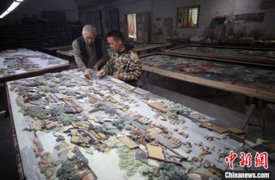 在瑞安市陶山鎮(zhèn)霞林村的陶峰工藝雕刻廠,彩石鑲嵌藝人李成者等人完成了彩石鑲嵌作品《清明上河圖》其中一部分。各色各樣的彩石流光溢彩,在工藝師傅的手中雕刻或拼接成一座座富麗堂皇的院落建筑,街道上絡(luò)繹不絕的車(chē)輛,集市上熙熙攘攘的人群……人物、場(chǎng)景栩栩如生,讓人嘆為觀止。