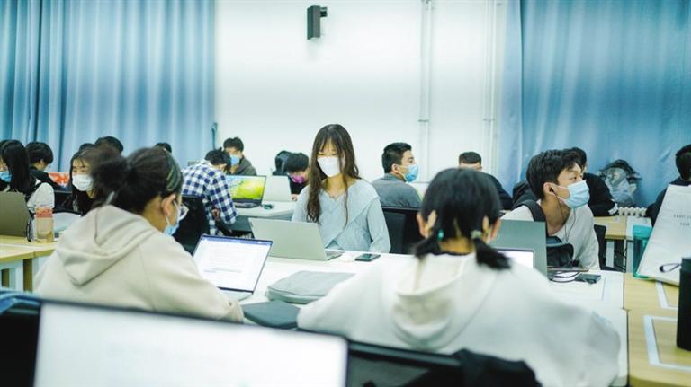 由于防疫原因,該校新聞與傳播學(xué)院李娟老師采取了線上與線下相結(jié)合的方式進(jìn)行教學(xué)。雖然老師不在教室中,但是該學(xué)院2021級(jí)專碩班的同學(xué)們?nèi)匀蛔谜R齊,認(rèn)真地上課、記錄筆記。研究生謝文新表示,“非常開心大家重新回到了同一個(gè)教室里。很久未見,格外期待與彼此進(jìn)行面對(duì)面的交流討論。雖然老師和一些同學(xué)暫時(shí)還沒有回到教室,但是完全恢復(fù)以往的學(xué)習(xí)生活指日可待。”