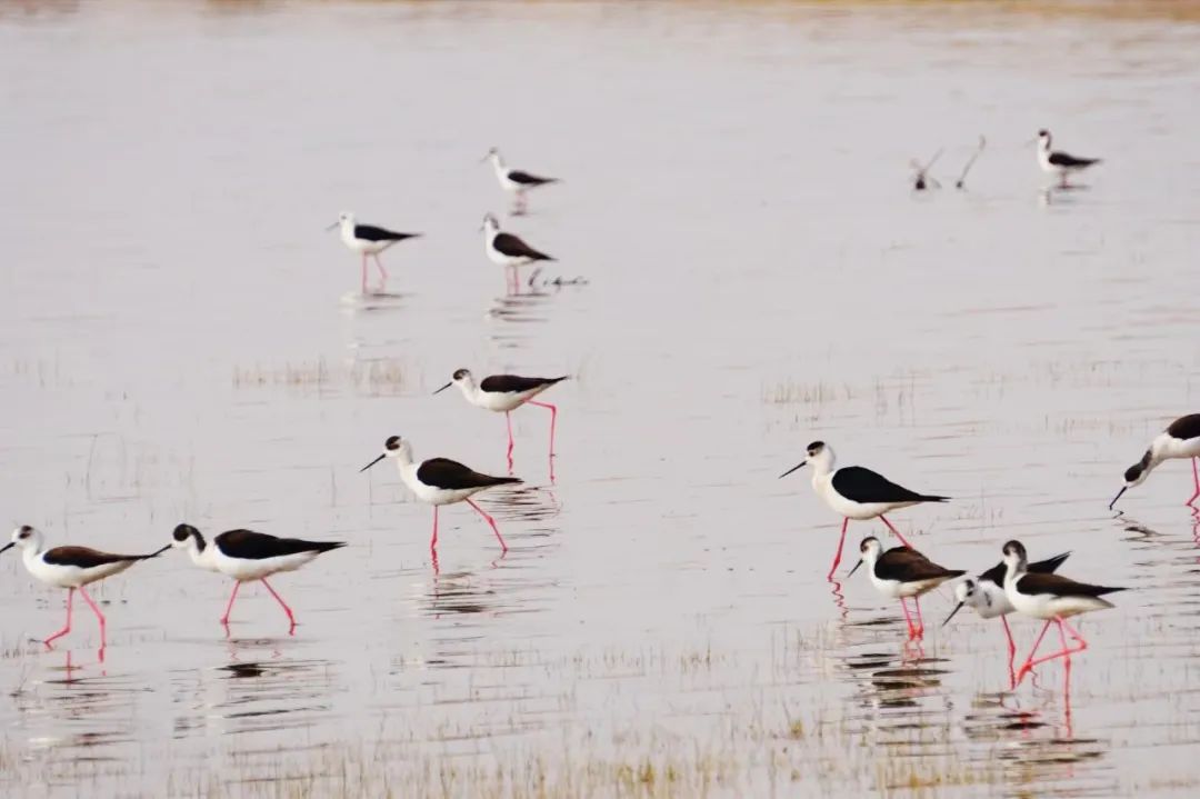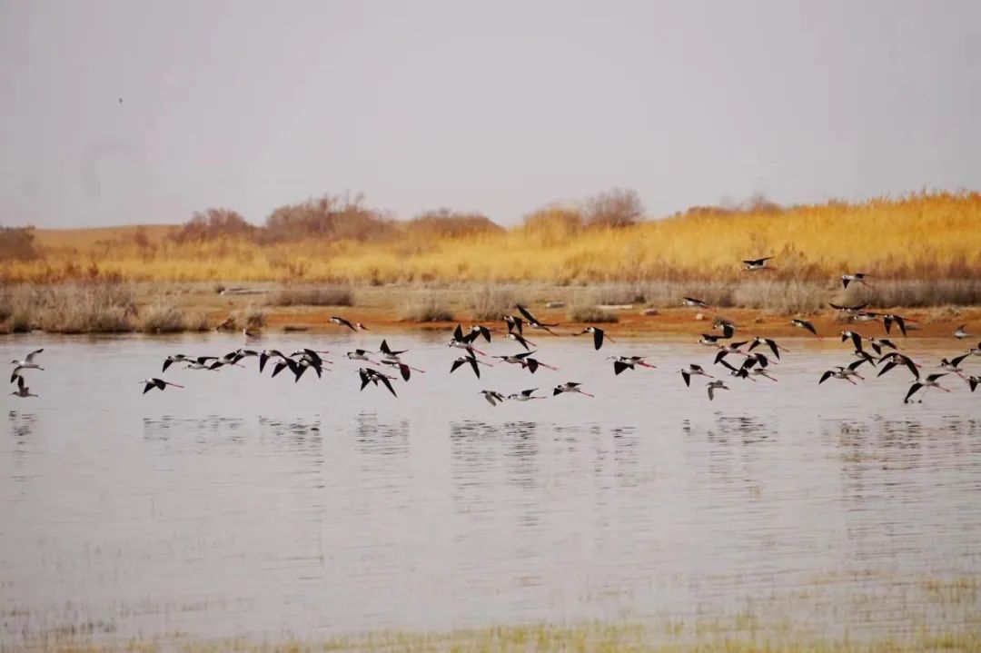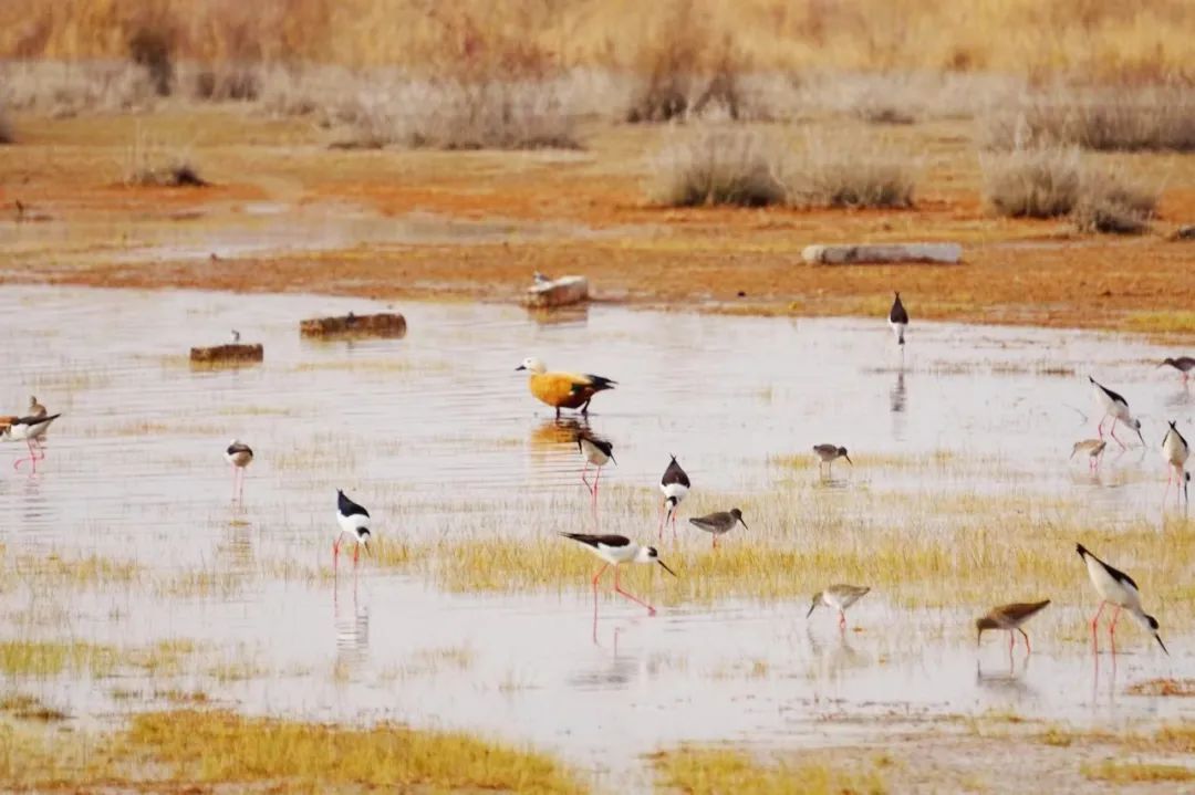 四月的敦煌大地春和景明,在庫姆塔格沙漠的邊緣,位于陽關(guān)濕地的壽昌海子波平如鏡,碧水映襯著祁連山上的雪峰,各種色彩斑斕地鳥兒仿佛收到了春天的邀約,在這里參加一場盛大的聚會。它們有的在湖面上引頸入水自在覓食,有的踏波翩翩起舞,有的追逐嬉戲鳴唱,有的在岸邊閑庭信步、悠然自得地曬太陽......構(gòu)成了一幅多姿多彩的和諧自然生態(tài)畫卷。