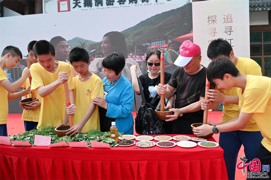 千人擂茶的場面,更是當(dāng)天的重點戲。游客們借助擂棍和擂缽,跟隨著非遺傳承人老師的節(jié)奏,將擂缽里的材料一一敲碎,擂出了濃郁的茶香味,也擂出了濃濃的客家情。