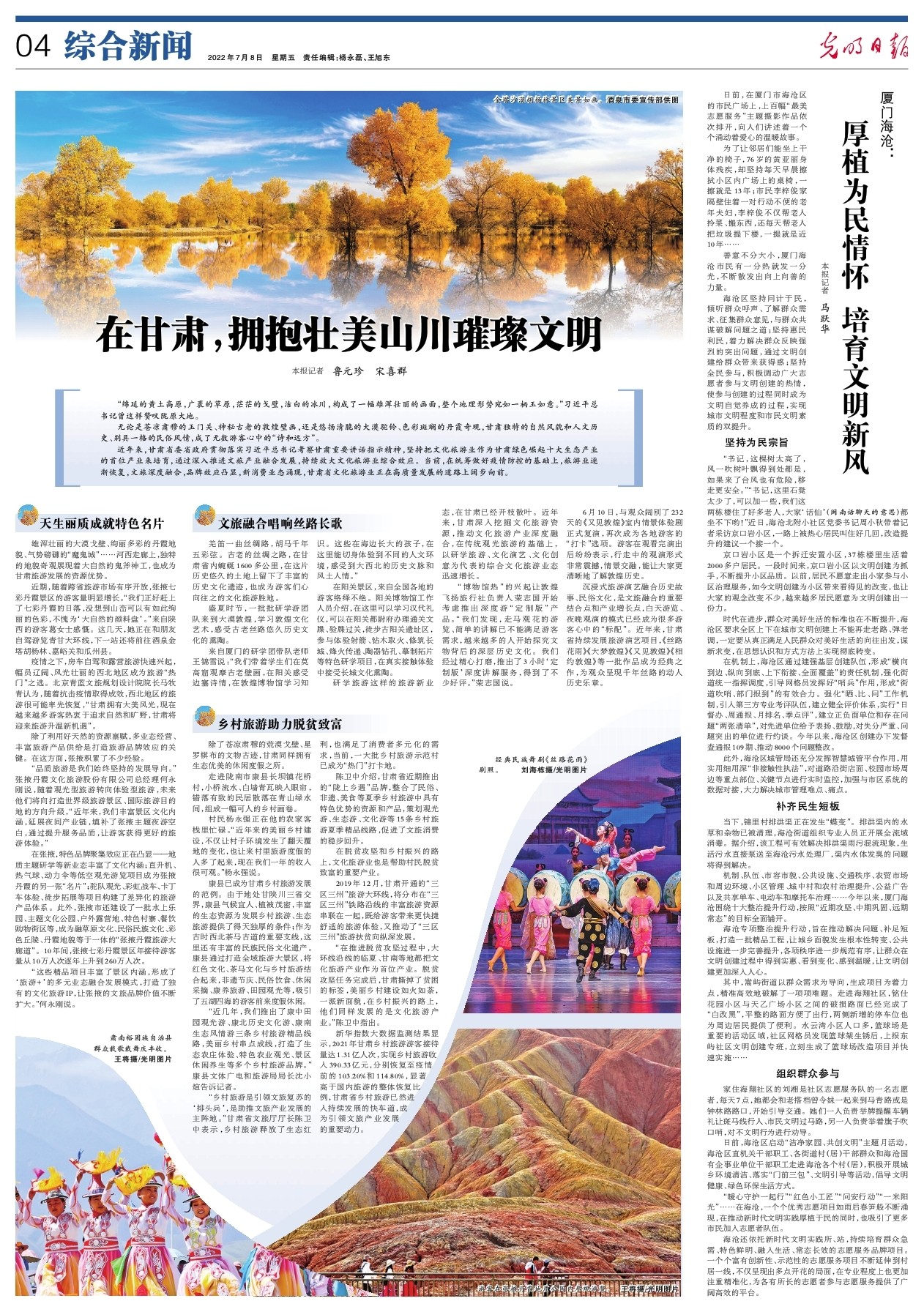 “品質(zhì)旅游是我們始終堅(jiān)持的發(fā)展導(dǎo)向。”張掖丹霞文化旅游股份有限公司總經(jīng)理何永剛說,隨著觀光型旅游轉(zhuǎn)向體驗(yàn)型旅游,未來他們將向打造世界級(jí)旅游景區(qū)、國際旅游目的地的方向升級(jí),“近年來,我們豐富景區(qū)文化內(nèi)涵,延展夜間產(chǎn)業(yè)鏈,填補(bǔ)了張掖主題夜游空白,通過提升服務(wù)品質(zhì),讓游客獲得更好的旅游體驗(yàn)。”