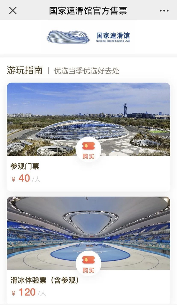 來這里參觀可以通過微信關注“國家速滑館”公眾號進行票務預約。參觀門票40元每人次。參觀加上冰的套票120元每人次。根據(jù)游客需求,也可以現(xiàn)場購買80元每人次的滑冰體驗票,其中包含了90分鐘的滑冰體驗和一套冰鞋一套護具。