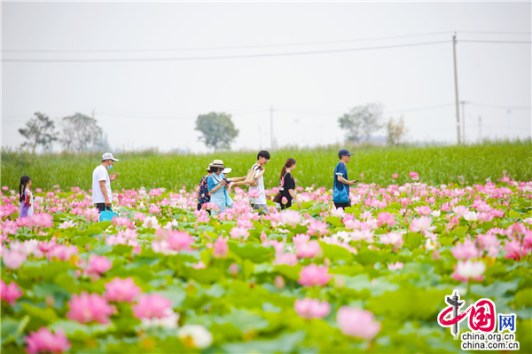 開幕式當(dāng)天,雅韻風(fēng)情的漢服美人,與荷花的幽香嫣然相得益彰,配著現(xiàn)場幾十把古箏的民樂演奏,顯得古典婉約;著一身淡雅精致的旗袍,行于生滿荷花馨香的木棧道之上,素手拂過帶著露珠的荷葉,構(gòu)成了一幅天然的荷風(fēng)畫卷,吸引著數(shù)十名畫家在這里揮筆創(chuàng)作;在荷塘深處,飛天舞者踏著碧波,乘著竹筏,在水面上翩翩起舞,這如詩如畫的表演讓游客仿佛已經(jīng)分不清現(xiàn)實(shí)與夢幻。更有油紙傘長廊、風(fēng)箏長廊、3D繪畫木棧橋、荷花主題打卡拍照墻等,讓來到這里的游客迅速進(jìn)入到國風(fēng)賞荷的意境中去。