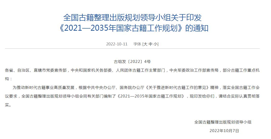 根據(jù)規(guī)劃,到2035年,古籍工作體制機制更加完善,標(biāo)準(zhǔn)規(guī)范體系基本健全,古籍保護(hù)、 整理研究和編輯出版成果豐碩,質(zhì)量明顯提升,古籍?dāng)?shù)字化資源建設(shè)取得重要進(jìn)展, 古籍普及深入推進(jìn),人才隊伍發(fā)展壯大,古籍工作在傳承和弘揚中華優(yōu)秀傳統(tǒng)文化中的作用更加突出。