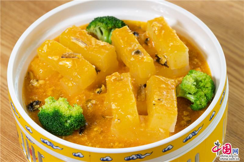 肉質(zhì)緊密的成熟冬瓜以高湯煨過,有股翡翠的溫潤通透。以新鮮金燦的蟹黃粉掛芡調(diào)味,入口即化,在齒頰間迸出幽幽的鮮味,醇厚的口感又不乏清新爽口的層次。