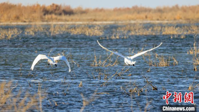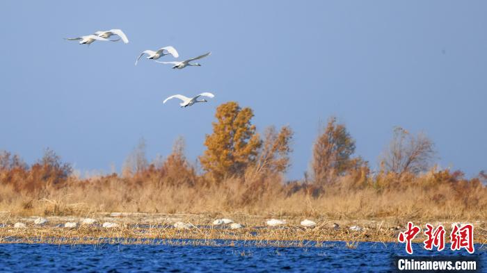 中新網(wǎng)烏魯木齊11月15日電(年磊)11月14日,位于新疆維吾爾自治區(qū)巴音郭楞蒙古自治州博湖縣境內(nèi)的博斯騰湖白鷺洲迎來大批天鵝,它們?nèi)宄扇航Y(jié)伴游弋,嬉戲追逐,優(yōu)雅的身姿成為博斯騰湖一道靈動的風(fēng)景線。