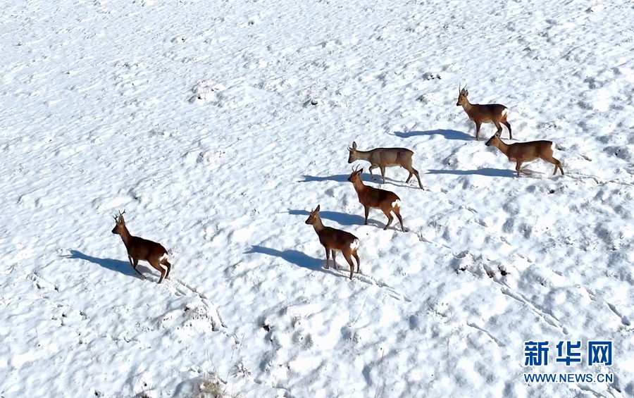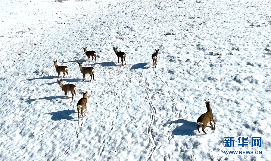 幾只狍鹿正在雪地“漫步”。新華網(wǎng)發(fā) (王曉涇 攝)