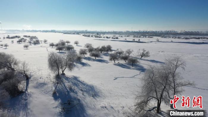 在霧氣的作用下,黑龍江江畔的樹木都披掛了一層冰晶,原本綠色的松柏覆蓋上了一層白紗。遠遠望去,一排排青松、楊樹、柳樹的樹冠似煙似霧,與藍天相接,形成了難得一見的霧凇美景,吸引了許多當?shù)鼐用耨v足拍照。