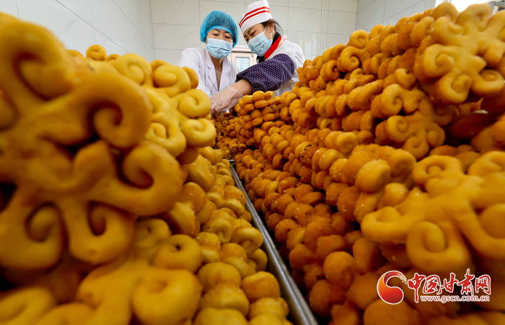 1月10日,在張掖市山丹縣一饃饃制作車間里,工作人員正在制作“糖花子”。