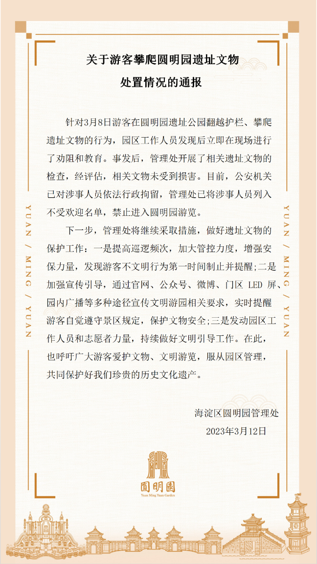 《通報(bào)》指出,針對3月8日游客在圓明園遺址公園翻越護(hù)欄、攀爬遺址文物的行為,園區(qū)工作人員發(fā)現(xiàn)后立即在現(xiàn)場進(jìn)行了勸阻和教育。事發(fā)后,管理處開展了相關(guān)遺址文物的檢查,經(jīng)評(píng)估,相關(guān)文物未受到損害。目前,公安機(jī)關(guān)已對涉事人員依法行政拘留,管理處已將涉事人員列入不受歡迎名單,禁止進(jìn)入圓明園游覽。
