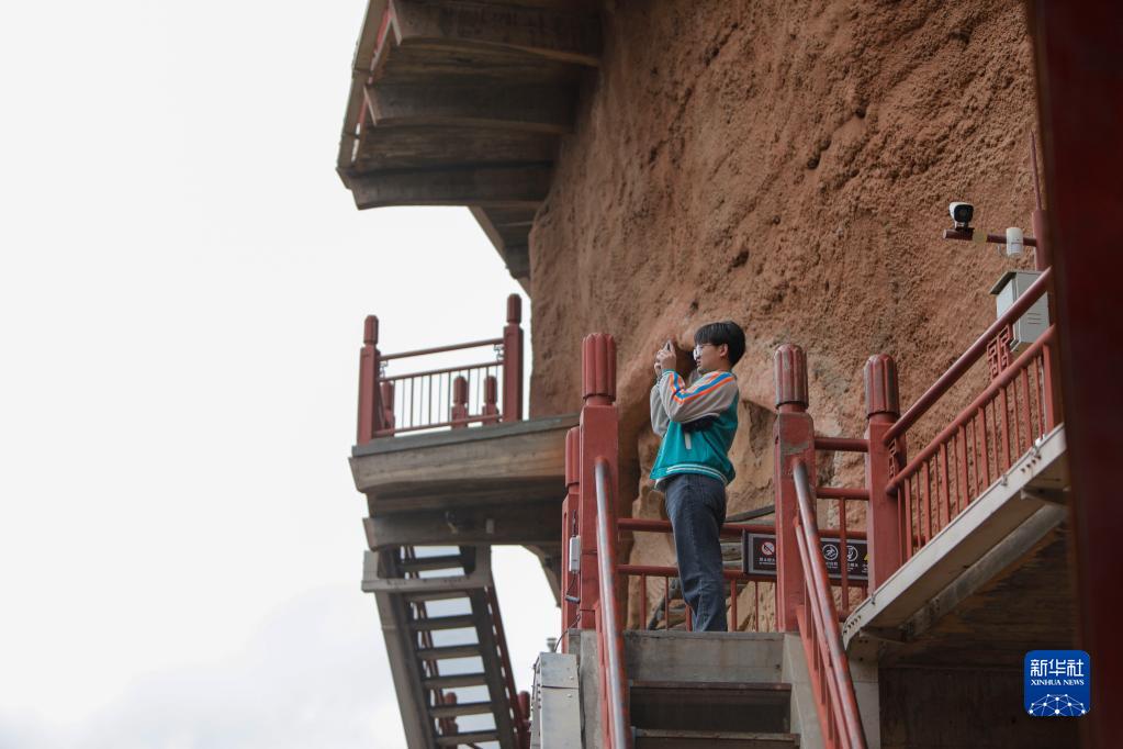 4月1日,游客在麥積山石窟參觀。新華社記者 方欣 攝