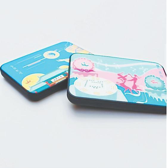 圖案來源于伏羲女媧因分別從山頂推下的兩磨盤緊緊結(jié)合的現(xiàn)象驗(yàn)證了上蒼意圖,決定繁衍后代的傳說?;瘌B騰飛之日與玉兔奔騰之月隔著天河星辰分懸兩邊,繪有河圖的磨盤見證生命的起源,雙人自由舞動(dòng)的身軀揚(yáng)起歡騰的節(jié)律,完美契合于陰陽(yáng)諧振的樂音。美好寓意的組合充溢起整個(gè)載體,令人傾心又矚目于彩色流韻的真景里。