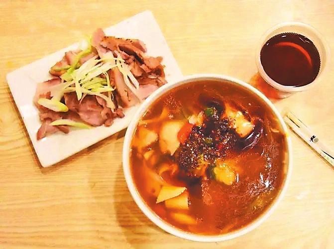 “涼州三套車”是由涼州行面、涼州鹵肉、涼州茯茶組成的——行面的筋道、鹵肉的軟香、茯茶的酸甜,這三樣美食合在一起才是“三套車”。