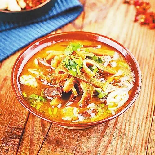 羊雜湯用煮羊肉的湯為原汁,放入切成細(xì)片的羊頭肉、羊肚、羊百葉,鮮湯加鹽、蔥白、香菜即可。西北的大蔥多用莖斜削,放于碗底,開(kāi)水燙后香味溢出。西北人喝湯習(xí)慣加油潑辣子,紅紅的一大片,微辣不燥。