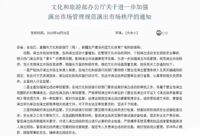 四是重點加強大型演出活動現(xiàn)場監(jiān)管。對臨時搭建舞臺、看臺的演唱會、音樂節(jié)等大型演出活動,文化和旅游行政部門要做好演出現(xiàn)場監(jiān)管,查驗演出舉辦單位的演出批準(zhǔn)文件及相關(guān)手續(xù),核驗演員信息及演出節(jié)目內(nèi)容,嚴(yán)禁擅自變更演員及演出內(nèi)容,嚴(yán)禁假唱、假演奏等違法違規(guī)行為。要配合公安部門做好現(xiàn)場安全管理,堅決防范演出安全事故發(fā)生。