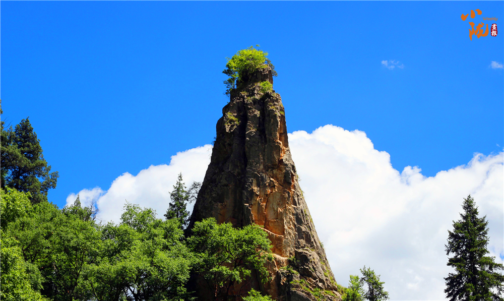 燈桿石,又名天筆峰,一巨石神似寶塔拔地而起,直插云端,塔尖宛如巨燭燈芯,熠熠生輝。