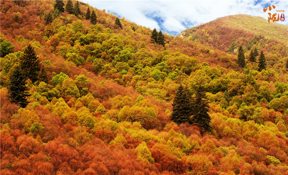 各種樹木依山勢成層密布,在金秋時(shí)節(jié)似浪花翻涌,山色隨著季相的變化依次呈現(xiàn)橙紅、嫩綠、碧黛和金黃,可謂層林盡染。