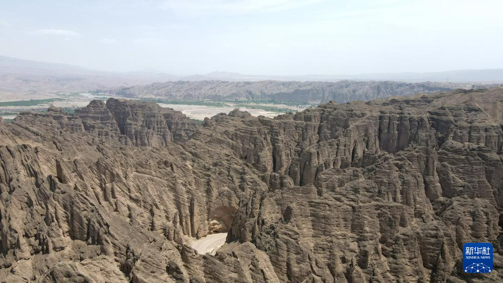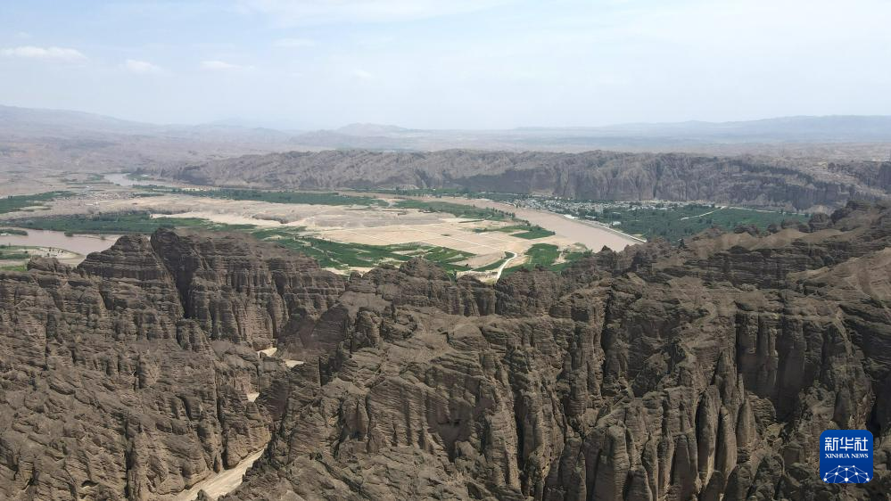 這是位于甘肅省白銀市景泰縣中泉鎮(zhèn)龍灣村的黃河石林景觀。黃河石林千峰競(jìng)奇、峽谷蜿蜒,與黃河遙相呼應(yīng),形成山環(huán)水轉(zhuǎn)、動(dòng)靜結(jié)合的自然奇觀(7月11日攝,無(wú)人機(jī)照片)。新華社記者 張可任 攝