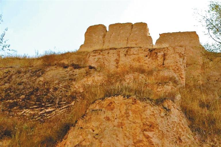 在威戎鎮(zhèn)見到的第一處遺存,是位于威戎鎮(zhèn)廣場(chǎng)后的一處臺(tái)地。這一處遺存,是一段殘破的老城墻,以及一座形似堡樓的殘?jiān)?。站在臺(tái)地之下,仰望斷墻,人工修筑的痕跡十分明顯,層層黃土夯筑,因?yàn)閺U棄殘破而長(zhǎng)滿了荒草。走近堡樓,可以看見當(dāng)時(shí)修筑時(shí)搭建木椽的孔洞,還有很多手掌大小的圓形石塊。