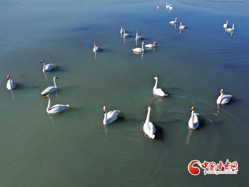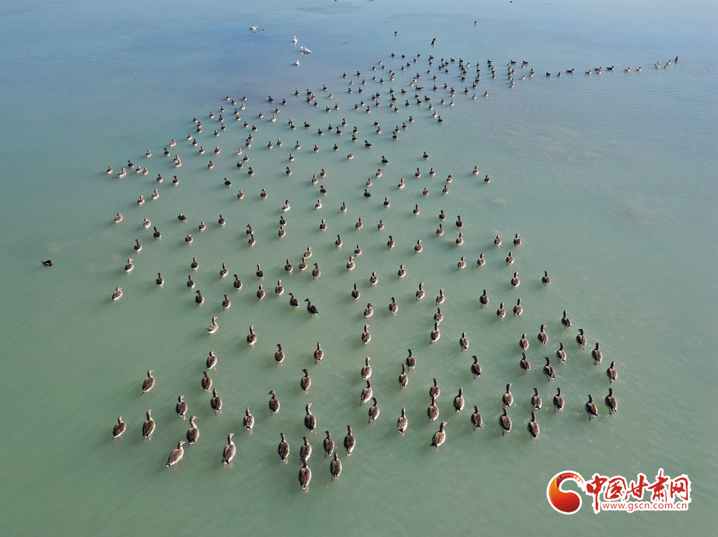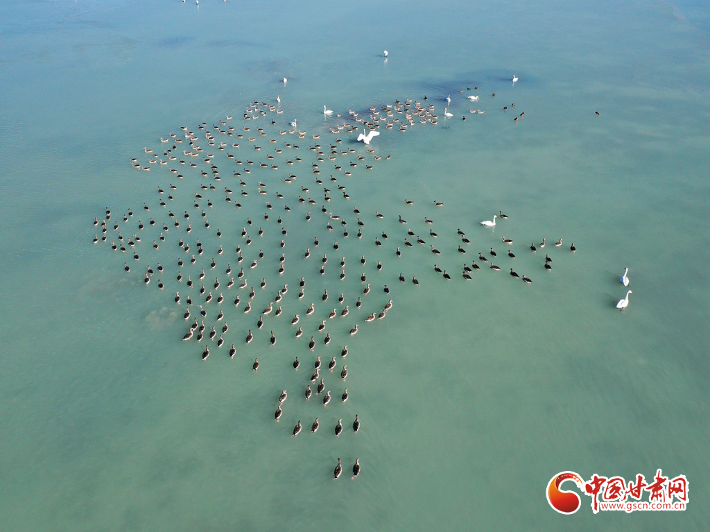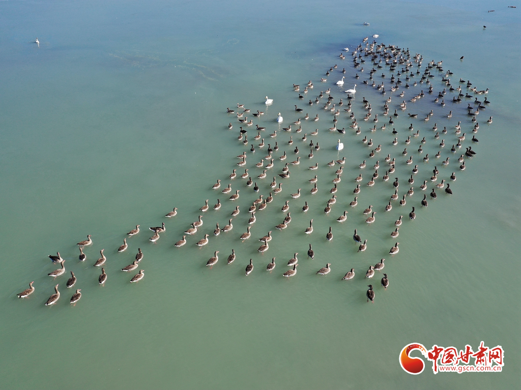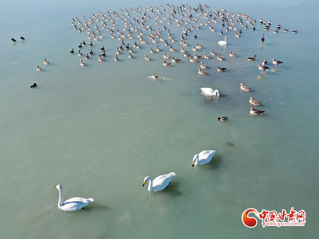 11月18日,在甘肅省張掖市臨澤縣新華農(nóng)場湖面上,眾多天鵝、灰雁和綠頭鴨等候鳥在此越冬棲息。