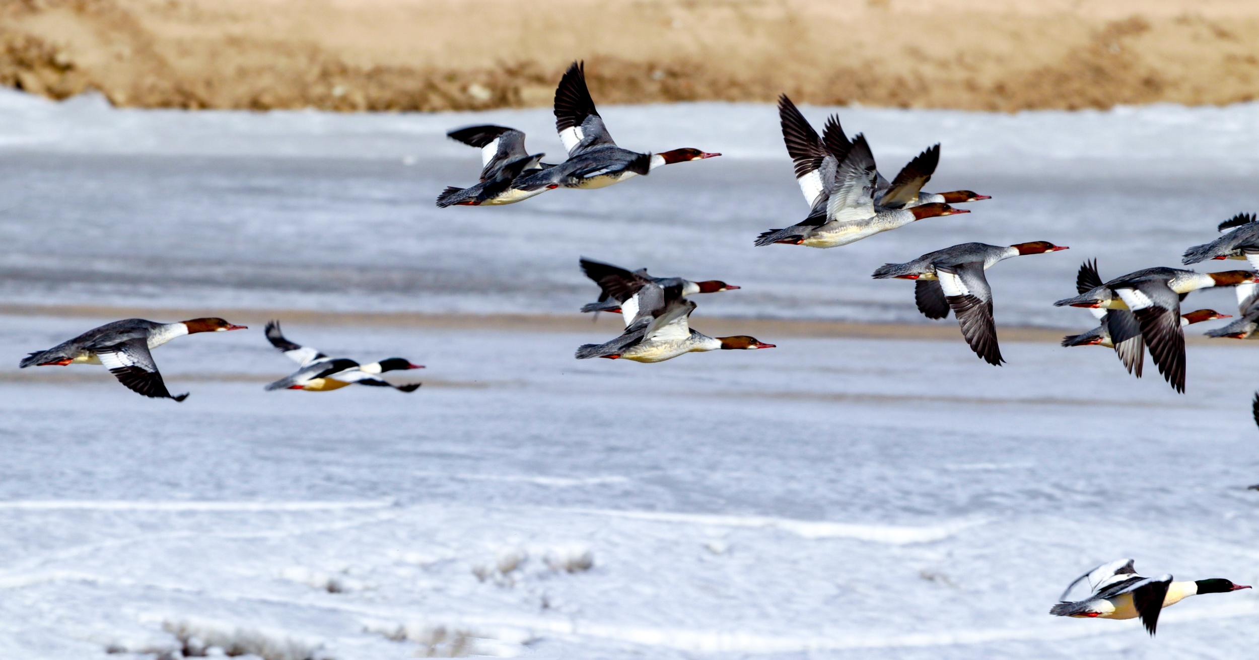 秋沙鴨在汭河上空展翅翱翔