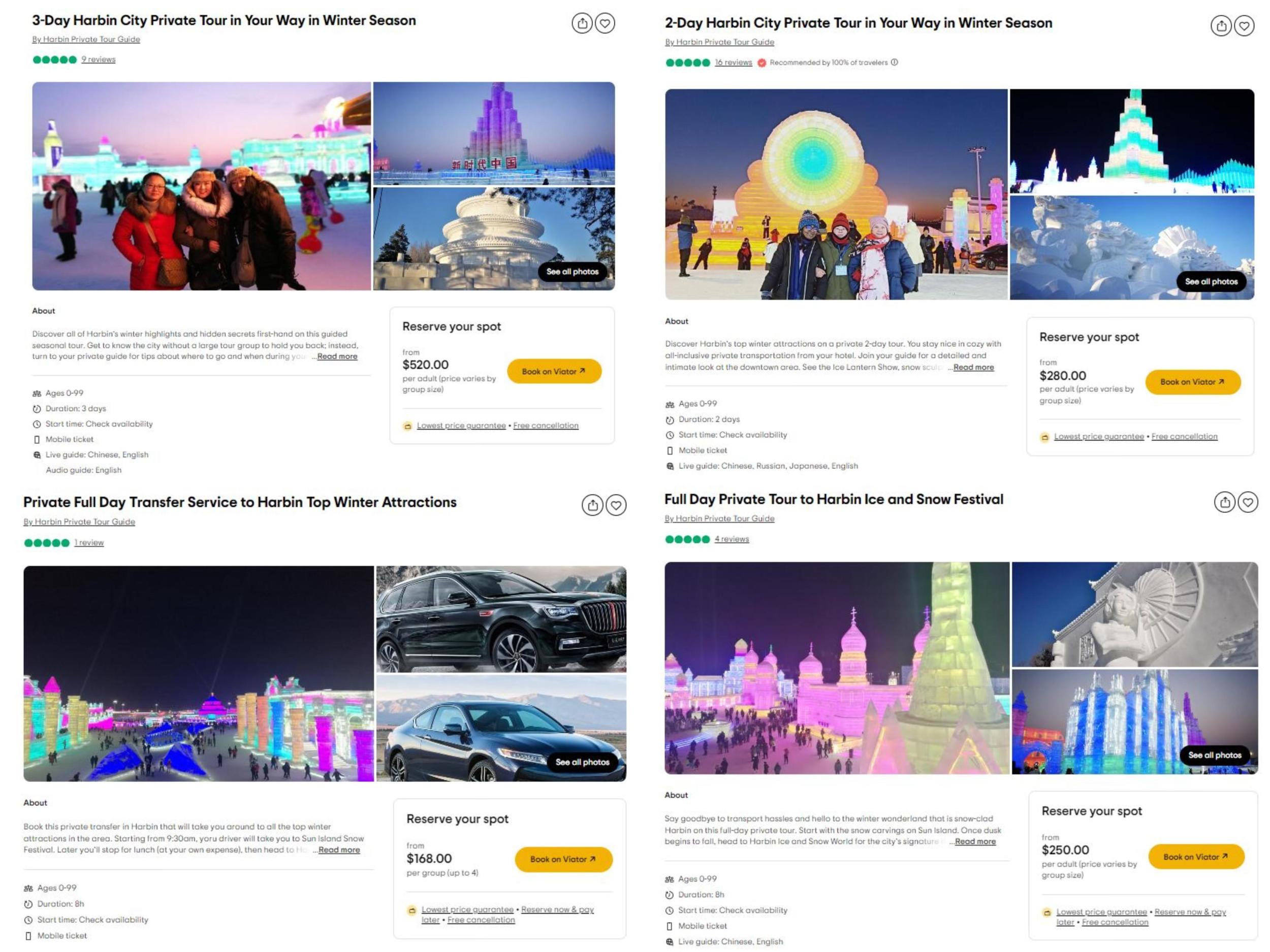 中新財經(jīng)查看Tripadvisor網(wǎng)站發(fā)現(xiàn),該平臺上有數(shù)十個關(guān)于哈爾濱旅游的服務(wù)。其中,“哈爾濱市冬季私人三日游”每位成人收費520美元起,“哈爾濱市冬季私人兩日游”每位成人收費280美元起,這兩個服務(wù)的費用不包括門票,包括私人導(dǎo)游服務(wù)、交通費(私人汽車或公交車/出租車)、酒店接送;“哈爾濱冬季熱門景點私人全日接送”每團(tuán)收費168美元起(最多4人),費用不包括門票等,包括私人汽車、私人司機(jī)服務(wù)、燃油附加費。