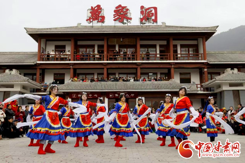 2024年2月21日,在甘肅省隴南市國家AAAA級景區(qū)——武都區(qū)萬象洞風(fēng)景名勝區(qū),當(dāng)?shù)厝罕娊M織的社火表演隊正在演出。