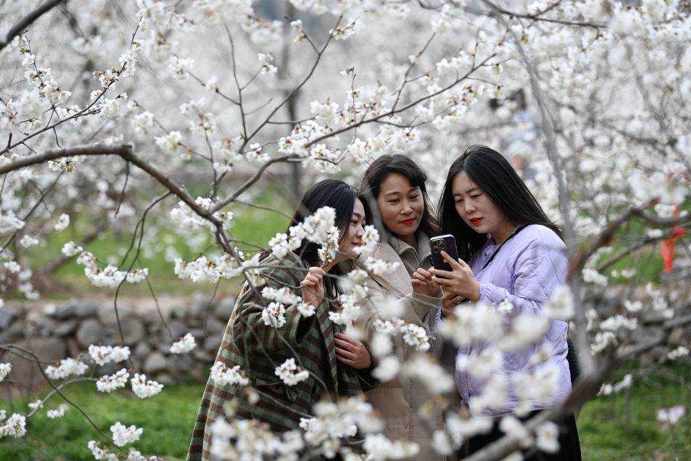 3月9日,幾名游客在隴南市武都區(qū)城關(guān)鎮(zhèn)石家莊村賞花踏青。新華社記者 陳斌 攝