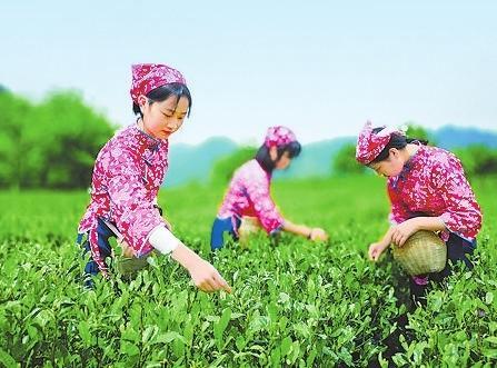 走進茶園里,看到數(shù)名茶農身挎小竹籮,慢慢穿行在茶樹之間,只見她們動作快速而嫻熟,一捻一放,徐徐前行在滿眼的綠意里。