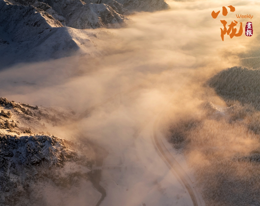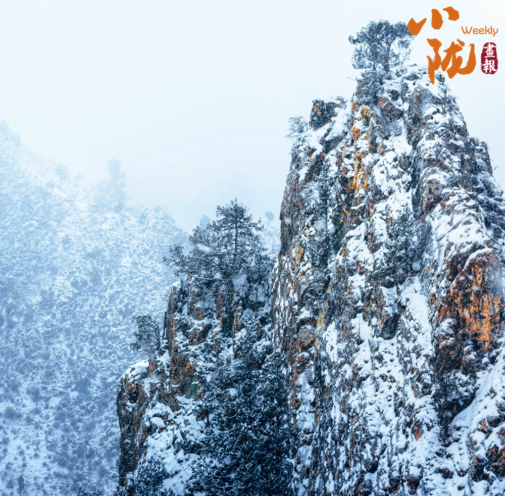 山巒草木都被純凈的白雪覆蓋,遠(yuǎn)處的群山蒼蒼茫茫、異峰林立、斷崖高聳,與天相接,天地間輕霧彌漫,渾然一體,讓人心馳神往。
