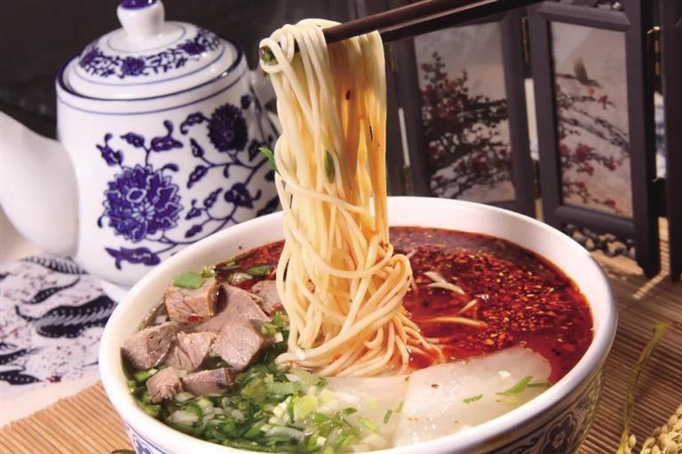 一碗熱氣騰騰的牛肉面,搭配鹵蛋和一盤(pán)牛肉,熱量雙倍的碳水誰(shuí)能不愛(ài)。蘭州牛肉面,起源于清代嘉慶年間,后經(jīng)傳承發(fā)展,以“一清(湯)二白(蘿卜)三紅(辣子)四綠(香菜蒜苗)五黃(面條黃亮)”等形式,統(tǒng)一了蘭州牛肉面的標(biāo)準(zhǔn)。一塊小小的面團(tuán),在蘭州牛肉面師傅手里可以現(xiàn)拉出九種面型,從細(xì)到粗、從窄到寬分別為毛細(xì)、細(xì)、二細(xì)、三細(xì)、二柱子、蕎麥棱、韭葉、薄寬、大寬。過(guò)去還有一種面型叫“工字面”,橫截面是火車(chē)鐵軌形狀,已經(jīng)基本失傳了。推薦蘭州人吃牛肉面的經(jīng)典吃法“肉蛋雙飛”(“肉蛋雙飛”就是在原有的牛肉面上加一顆鹵蛋和一份牛肉)。