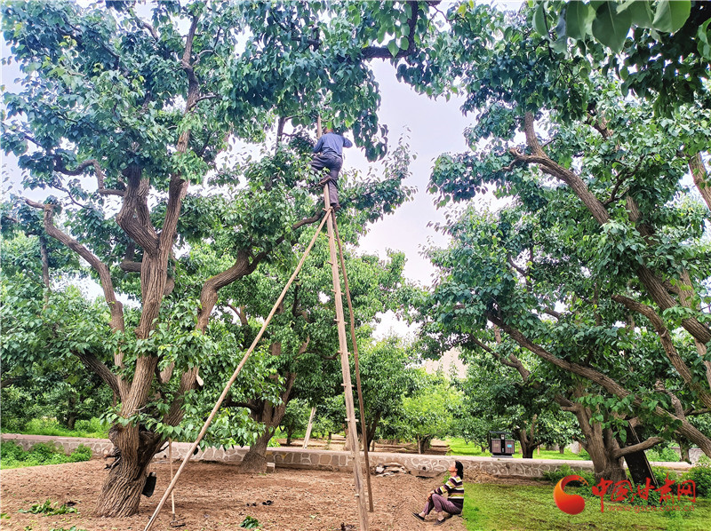 初夏走進古梨園,梨樹進入疏果期,腳登“蜈蚣梯”的“天把式”又開始忙碌了。