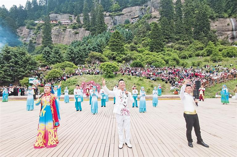 六月的松鳴巖滿目蔥郁、碧水悠悠,讓人如在畫中游。三孔橋會(huì)場(chǎng)內(nèi)早已是人山人海,熱鬧非凡,伴隨著歡快的歌曲,由1600多人組成的花兒串燒巡演團(tuán)隊(duì)在這里載歌載舞,共同唱響《花兒留住天下客》,將活動(dòng)推向了高潮,歌聲和掌聲是人們對(duì)幸福生活的感恩之情和對(duì)美好明天的憧憬。