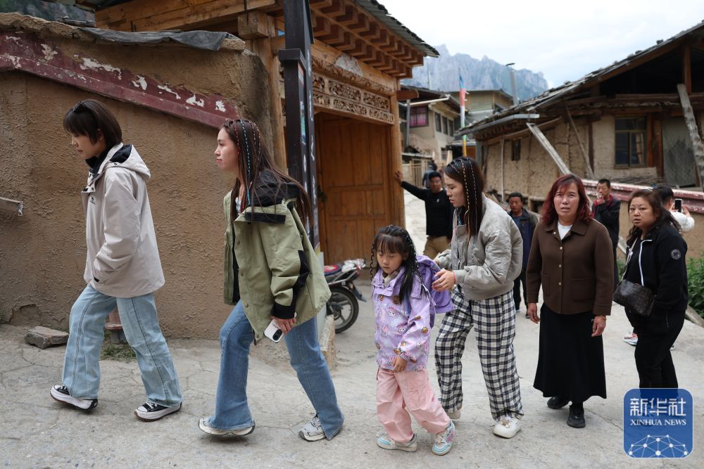 ↑ 扎尕那村一家民宿工作人員仁青(右)幫助前來住宿的游客搬運(yùn)行李(6月27日攝)。新華社記者 陳斌 攝