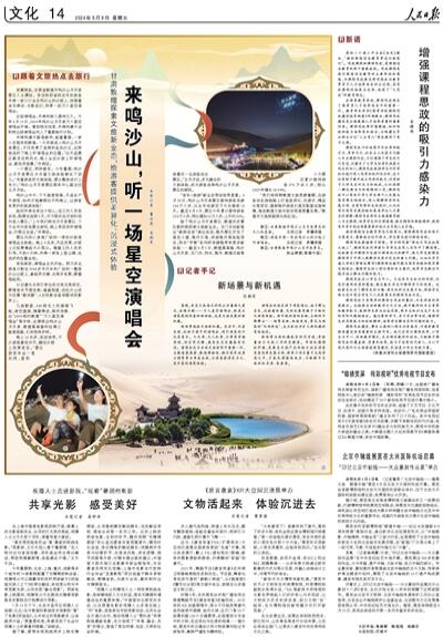 新場景造就文旅新機(jī)遇。采訪中,記者發(fā)現(xiàn),這場沙漠中的演唱會,吸引游客的不僅是音樂。燈光秀、無人機(jī)秀、沙屏秀穿插亮相,炫彩熒光棒、鹿角發(fā)光發(fā)箍備受歡迎。演唱會成為當(dāng)?shù)匚穆镁仃囍兄匾画h(huán),與敦煌莫高窟、敦煌博物館、雅丹國家地質(zhì)公園等景點(diǎn)串連成線,讓游客獲得更多元、更豐富的游覽體驗(yàn)。