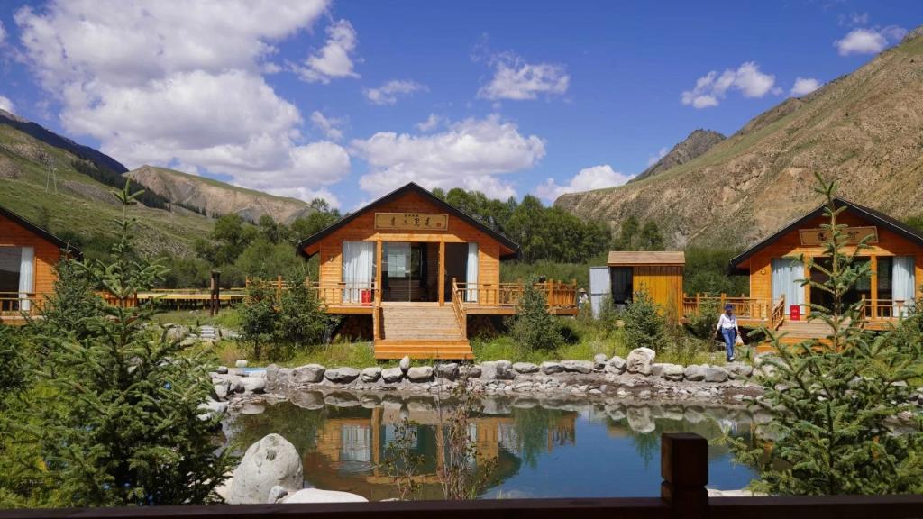 2023年7月起,安玉軍和幾戶村民改造自家院子,騰出開設農家樂、牧家樂的房子,并打造燒烤和露營基地。步入基地,幾池清水將基地分成不同區(qū)域,木屋、牙帳、露臺散布其間,人們環(huán)繞池間小路行走,周邊連綿的祁連山上松木成林,牛羊悠閑。