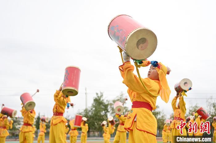 9月9日,甘肅省蘭州市皋蘭縣三川口學(xué)校學(xué)生練習(xí)蘭州太平鼓。近年來,皋蘭縣將國(guó)家級(jí)非物質(zhì)文化遺產(chǎn)蘭州太平鼓納入各中小學(xué)課后服務(wù)內(nèi)容,成立中小學(xué)太平鼓隊(duì)13支,定期邀請(qǐng)非遺傳承人走進(jìn)校園,進(jìn)行傳統(tǒng)文化授課和培訓(xùn),使學(xué)生親身感受中華優(yōu)秀傳統(tǒng)文化的魅力。蘭州太平鼓舞已有六百余年的歷史,素有“天下第一鼓”之稱,2006年被列入中國(guó)第一批非物質(zhì)文化遺產(chǎn)名錄。中新社記者 九美旦增 攝