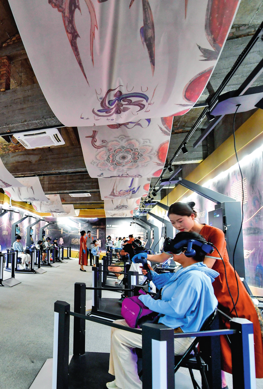 游客在敦煌體驗(yàn)“尋境敦煌——數(shù)字敦煌沉浸展”(2024 年 7 月 22 日攝) 郎兵兵攝 / 本刊