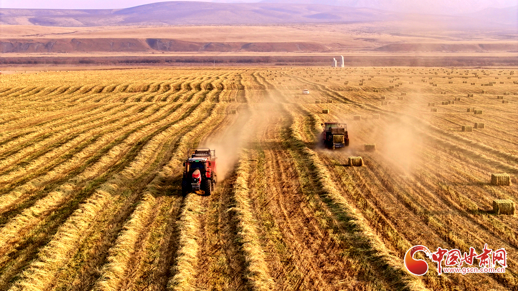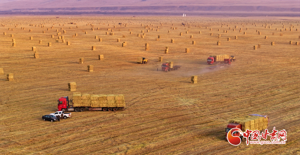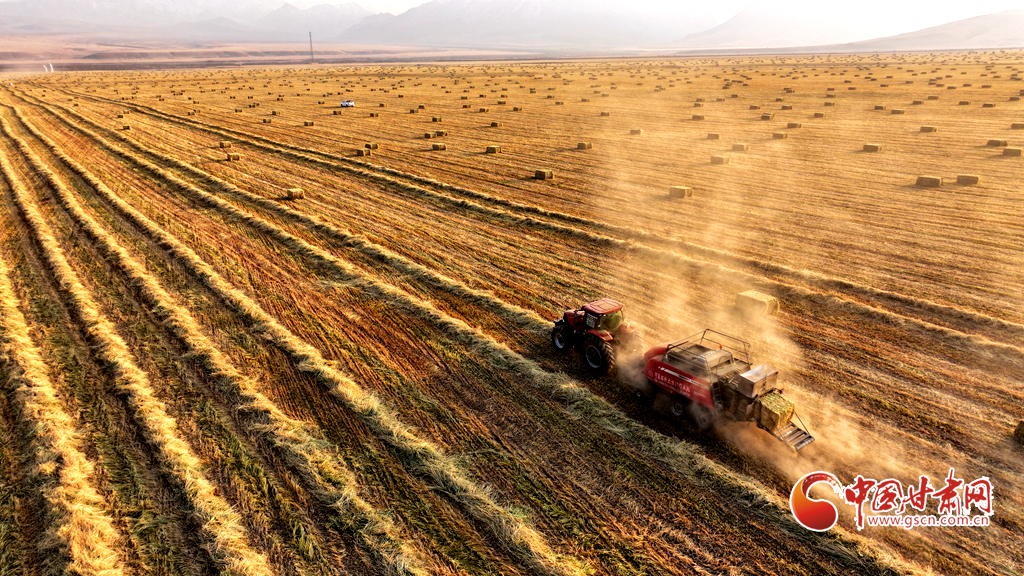 11月11日,甘肅山丹馬場(chǎng)的10萬畝燕麥草進(jìn)入打包高峰期,田野上呈現(xiàn)出一派繁忙而有序的景象。放眼田間,大型農(nóng)用機(jī)械來回穿梭,將燕麥草迅速壓縮、打包,一個(gè)個(gè)草捆整齊排列。與此同時(shí),滿載草捆的運(yùn)輸車在田間小道上來回奔波,將成品送往倉(cāng)庫和銷售地。