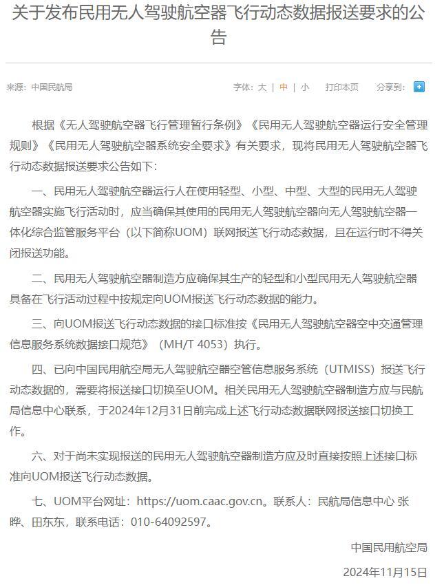 11月15日,民航局發(fā)布《關(guān)于發(fā)布民用無(wú)人駕駛航空器飛行動(dòng)態(tài)數(shù)據(jù)報(bào)送要求的公告》(以下簡(jiǎn)稱(chēng)《公告》)。