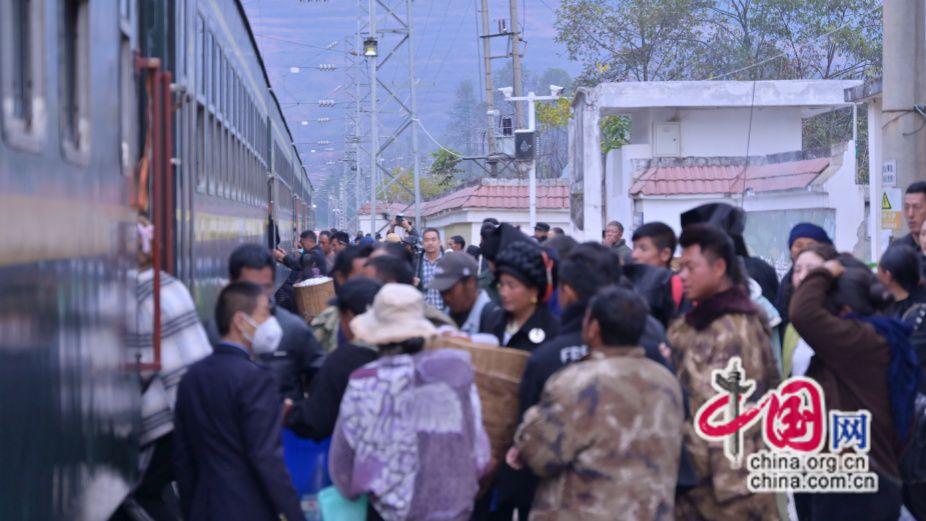 2024年11月20日,彝歷新年第一天,成昆線5633次慢火車??吭谡九_(tái),彝族同胞有序乘車。原波 攝