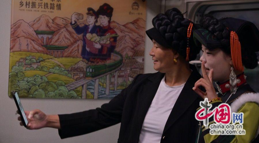 沿途,每當(dāng)列車??吭谲囌镜却臅r(shí)間,彝族老鄉(xiāng)在鐵路工作人員的協(xié)同配合下搬起水果,牽起牛羊,抱起雞鴨放進(jìn)一節(jié)節(jié)行李車廂上,慢火車的貨架上擺滿了農(nóng)產(chǎn)品。車廂里,人們互相交談,圍坐在一起放聲歌唱,好不熱鬧,歡樂(lè)的聲音從車廂內(nèi)傳出,像是在向廣袤的山川大地宣告著彝歷新年的盛事。