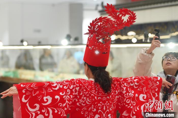 11月23日,甘肅省蘭州市求古書院內(nèi),剪紙漢服作品吸引游人拍照參觀。中新社記者 李亞龍 攝