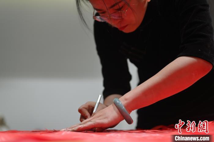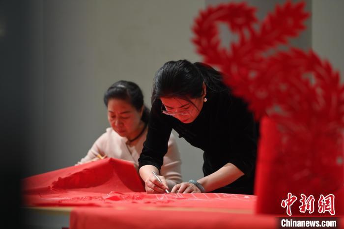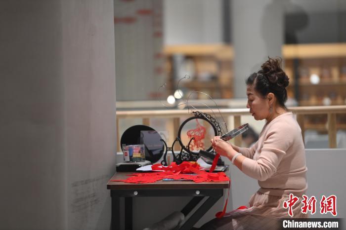 11月23日,甘肅省蘭州市楊樹珍剪紙工作室內(nèi),楊樹珍團(tuán)隊(duì)成員制作剪紙漢服作品。中新社記者 李亞龍 攝