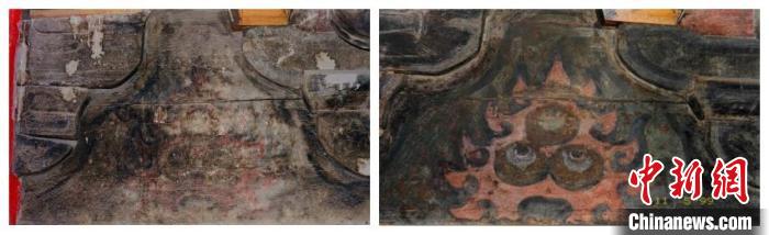 圖為1999年拍攝的長樂門內(nèi)檐彩畫顏料層顯色加固前后對比。(陜西師范大學(xué)歷史文化遺產(chǎn)保護教育部工程研究中心供圖)