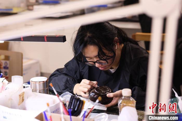 11月27日,南昌漢代?;韬顕z址博物館的漆器修復室內(nèi),文物修復師正在修復一件漆器?!⑺紓?nbsp;攝