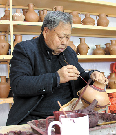 64歲的閻建林(見(jiàn)圖,本報(bào)記者趙帥杰攝)是甘肅省級(jí)非物質(zhì)文化遺產(chǎn)項(xiàng)目陶器制作技藝代表性傳承人。走進(jìn)他位于定西市臨洮縣洮陽(yáng)鎮(zhèn)河口村的家中,院落里、窗臺(tái)上,擺滿了大大小小的陶器,足有上百種。“主要是馬家窯彩陶工藝品,敞口的是盆,帶頸的為罐,耳部安有提手的,還可以稱作壺。”閻建林介紹。