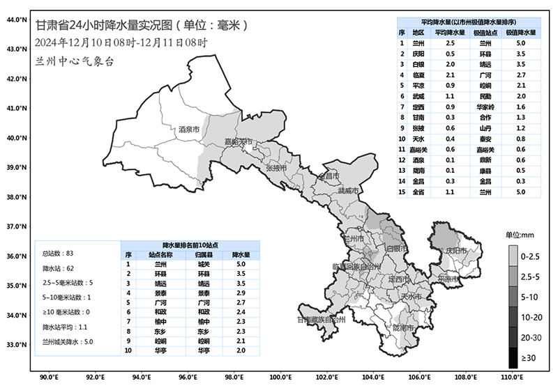 中國甘肅網12月11日訊(西北角·中國甘肅網記者 沈文剛)12月10日8時至12月11日8時,全省共計62個縣區(qū)出現(xiàn)小雪,其中蘭州主城區(qū)出現(xiàn)大雪,慶陽北部、白銀中部和北部、臨夏西南部出現(xiàn)中雪。較大降水量出現(xiàn)在蘭州本站5.0mm、靖遠3.5mm、環(huán)縣3.5mm、景泰2.9mm、廣河2.7mm。
