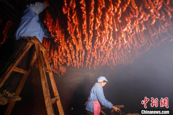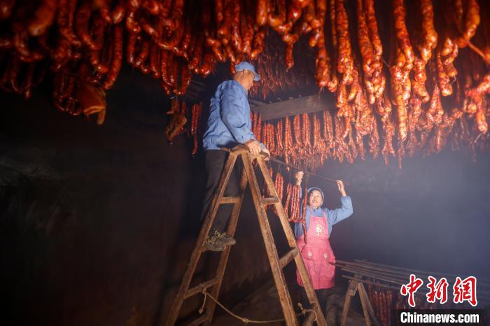 圖為貴州施秉一企業(yè)工人在下架剛熏制好的香腸。新年臨近,貴州省黔東南苗族侗族自治州施秉縣部分農(nóng)戶和企業(yè)紛紛加工趕制臘肉、香腸、血豆腐等傳統(tǒng)臘味,通過(guò)“線上+線下”銷(xiāo)售方式,供應(yīng)市場(chǎng),喜迎新年。磨桂賓 攝